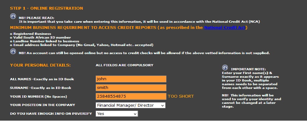 ** NB! An account can still be opened online but no access to credit checks will be allowed if the above vetted information is not supplied.