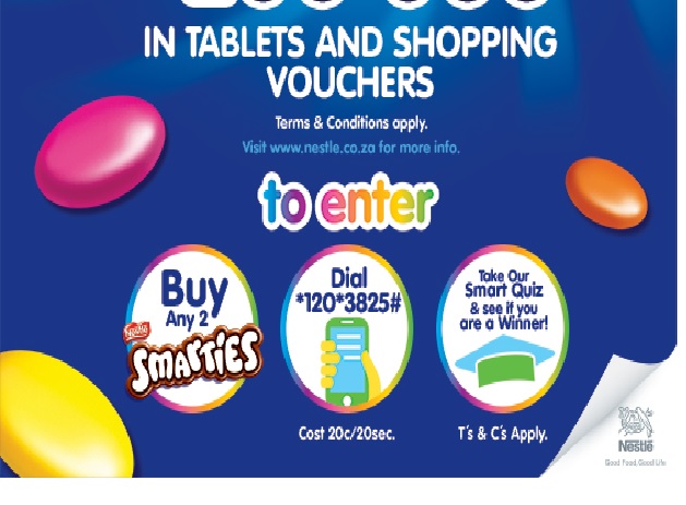 ** Participants must purchase any 2 participating Nestlé SMARTIES products as listed below and dial *120*3825# to stand a chance to win R200,000 in Tablets and Shopping Vouchers.