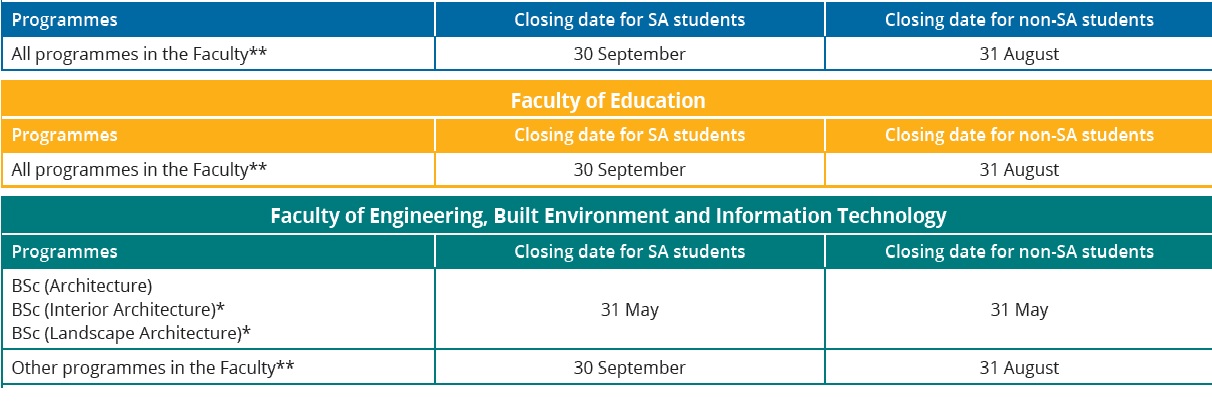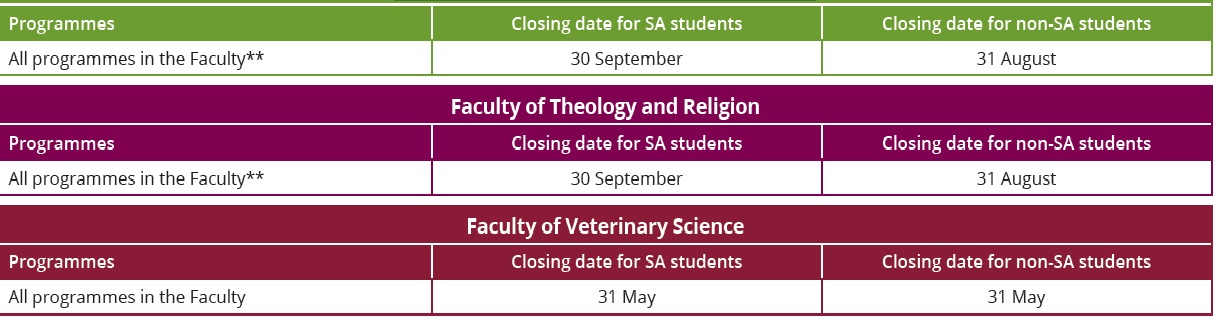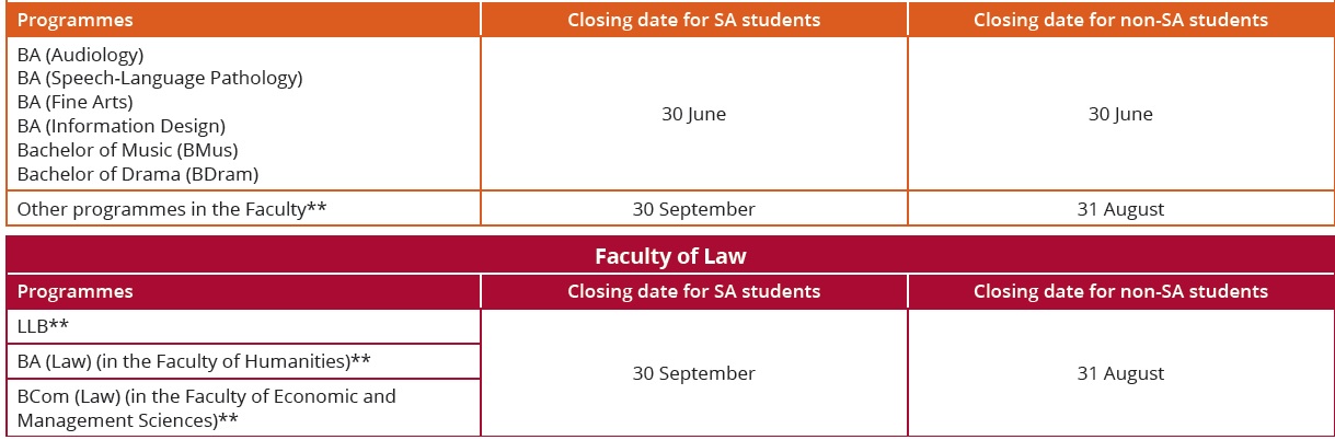 ** Application for admission to undergraduate study programmes for both South African and non-South African citizens close on the dates specified below in the year preceding the year of study.