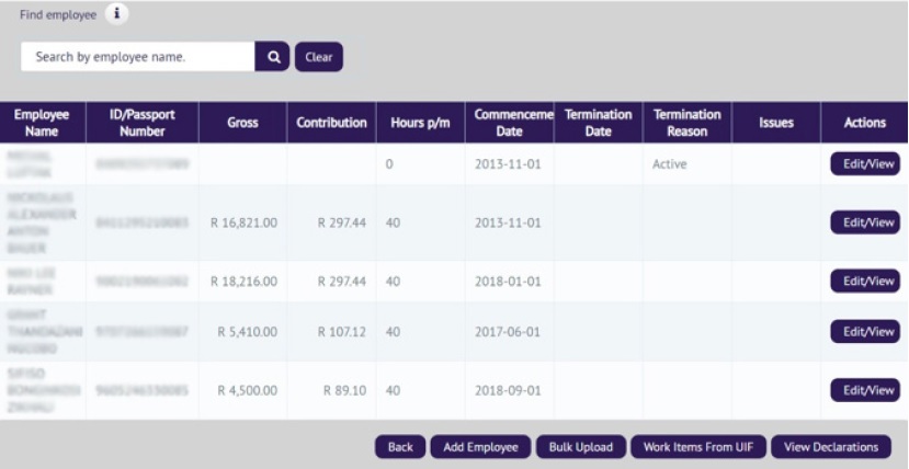 Step 4 : Then go to the declarations manager and click on your company to see which employees are declared. If there are any missing, click ‘Add Employee’ (you can only add employees you have been making UIF contributions for)