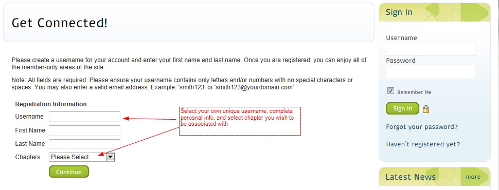 Once you created a unique username, enter name/surname, select a Chapter you wish to belong to and continue.
