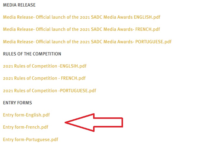 d) All works entering the competition should be in one of the SADC working languages, i.e. English, Portuguese, French and any national indigenous language of the SADC Region and should be submitted together with the transcript in one of the three SADC working languages, i.e. English, French and Portuguese. These should be published/broadcast (newspaper cutting, websites, magazines, audio CDs, USB and newsletters;