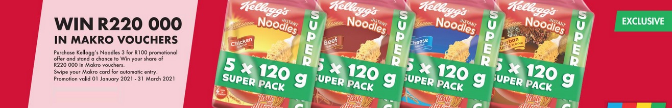 ** You will be eligible to enter the competition when you purchase any five 120g Kelloggs instant noodles packs on the 3 for R100 More 4 Less deal in-store or online on www.makro.co.za.