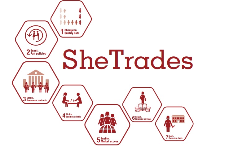 The ITC SheTrades initiative aims to connect three million women to market by 2021 and rallies stakeholders around the world to work together on seven actions as illustrated in figure 1 to address trade barriers and create greater opportunities for women entrepreneurs. It is supported by a web and mobile digital platform.
