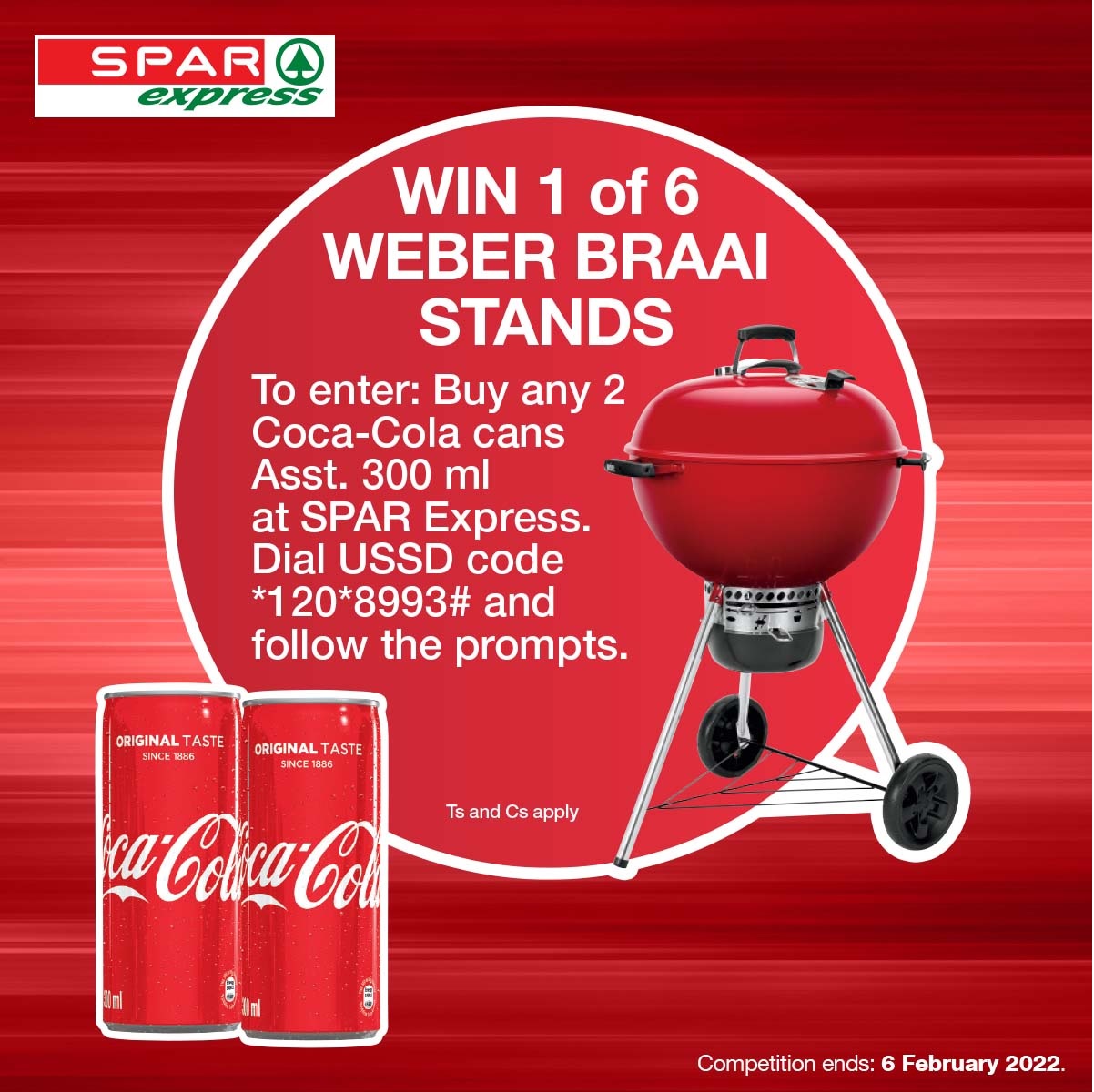Win 1 of 6 Weber Braai Stands Competition is organised by SPAR Express. This promotional competition is open to all South African residents who are 18 years or older This promotional competition starts on Tuesday, 11 January 2022 and ends on Sunday, 6 February 2022. Stand a chance to win one of six Weber braai stands by purchasing any 2 x Coca-cola cans assorted 300 ml.