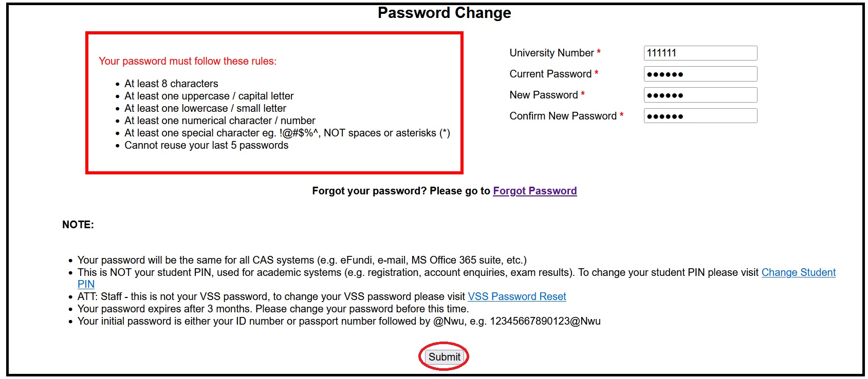 ** Your password will be the same for all CAS systems (e.g. eFundi, e-mail, MS Office 365 suite, etc.)