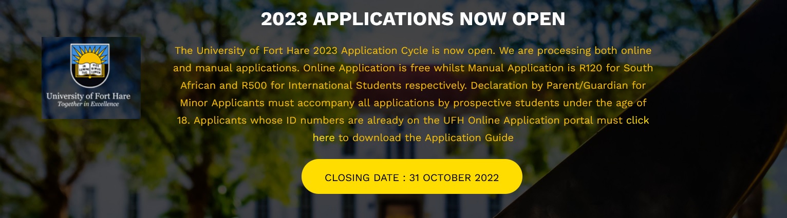 The University of Fort Hare (UFH) 2023 Admission Application Cycle is now open. We are processing both online and manual applications. Online Application is free whilst Manual Application is R120 for South African and R500 for International Students respectively.