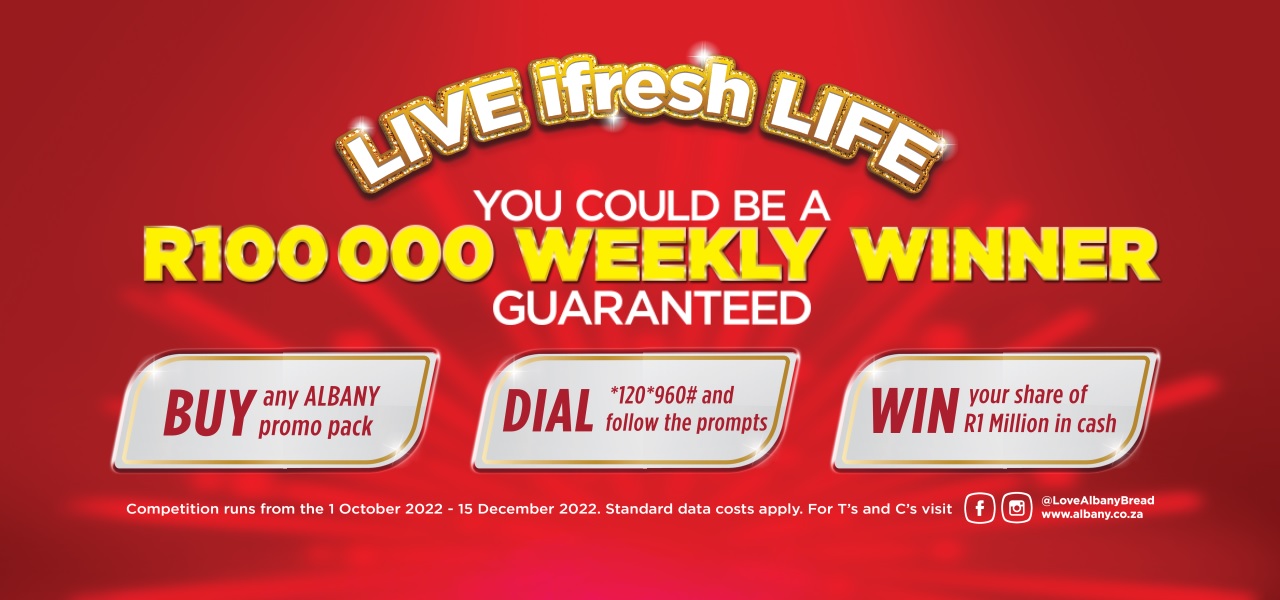 ALBANY iFRESH Life Q1 F23 Promotional Competition is conducted by Tiger Consumer Brands Limited. Residents of South Africa can participate in the contest. Purchase any one of the mentioned Albany products with the promotional pack to participate in the Competition. 1 (one) of 10 (ten) cash prizes to the value of R100 000.00 (one hundred thousand Rands) each. Last date of the contest is 15th December 2022.