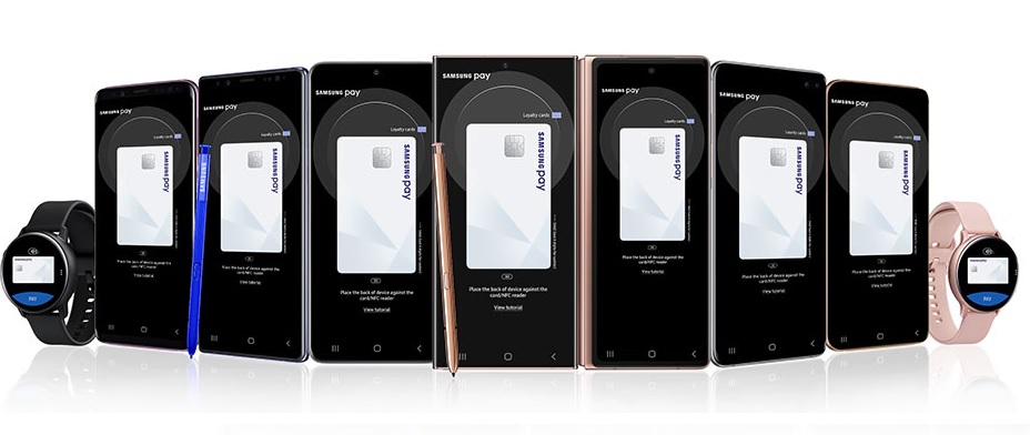 Samsung Pay supported smartphones and wearables: Galaxy Z Fold3 5G, Galaxy Z Flip3 5G, Galaxy Z Fold2, Galaxy Fold, Galaxy Z Flip, Galaxy S22 (NFC only), S22+ (NFC only), S22 Ultra (NFC only), Galaxy S21 (NFC only), Galaxy S21 FE (NFC only), S21+ (NFC only), S21 Ultra (NFC only), S20 Ultra, S20+, S20, S20 FE, S10+, S10, S10e (NFC only), S9+, S9, S8+, S8, S7 Edge, S7 (NFC only), Note 20 Ultra 5G, Note 20 Ultra, Note 20 5G, Note 20, Note 10+, Note 10, Note 10 Lite (NFC only), Note 9, Note 8, A9 (NFC only), A80 (NFC only), A8, A73 5G (NFC Only), A72 (NFC only), A71 (NFC only), A70 (NFC only), A7 (2017), A53 5G (NFC Only), A52 | A52 5G (NFC only), A51 (NFC only), A5 (2017), A33 5G (NFC Only), A32 | A32 5G (NFC only), A31 (NFC only), A30s (NFC only), A23 (NFC Only), A22 LTE (NFC Only), A13 5G (NFC only), Galaxy Watch 4, Galaxy Watch 3, Galaxy Watch, Watch Active, Watch Active2, Gear S3 and Gear Sport. Only South African models will be supported (XFA / XFV SKU Codes).