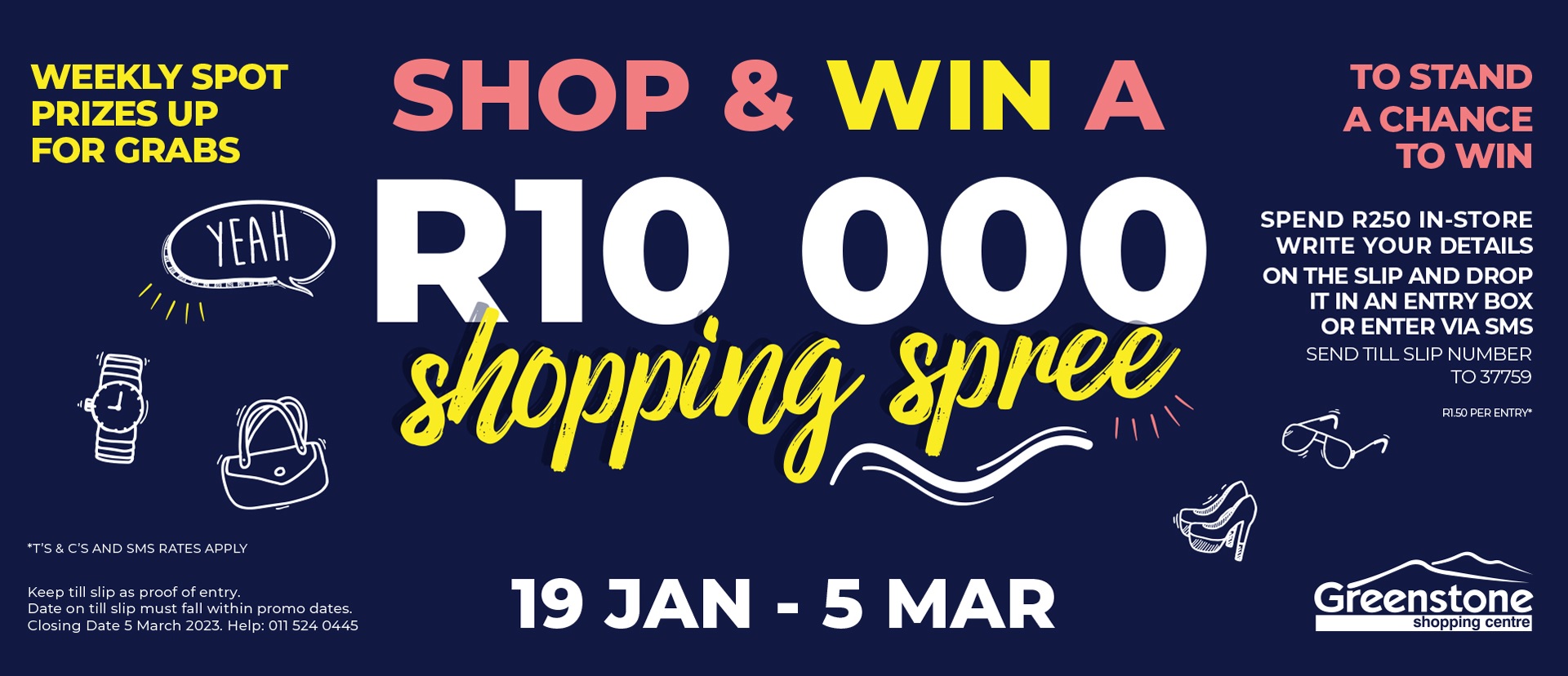 1. Spend R250.00 at any shop in Greenstone Shopping Centre, write their name and contact number on the till slip and place it into a completion entry box or