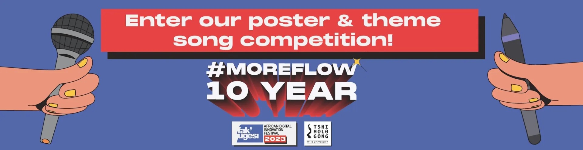 The Fak’ugesi Festival Poster Competition is BACK for our 10-year anniversary! This year we are expanding our reach to pan-African musicians. Win the opportunity to direct the look and feel of the festival by submitting a design for the festival poster or theme song. This is an invitation to pan-African illustrators and musicians, the winners will receive R5000 ZAR each and the exciting experience of working with the Fak’ugesi team. This year we say #MoreFlow for our future in digital creativity and innovation.