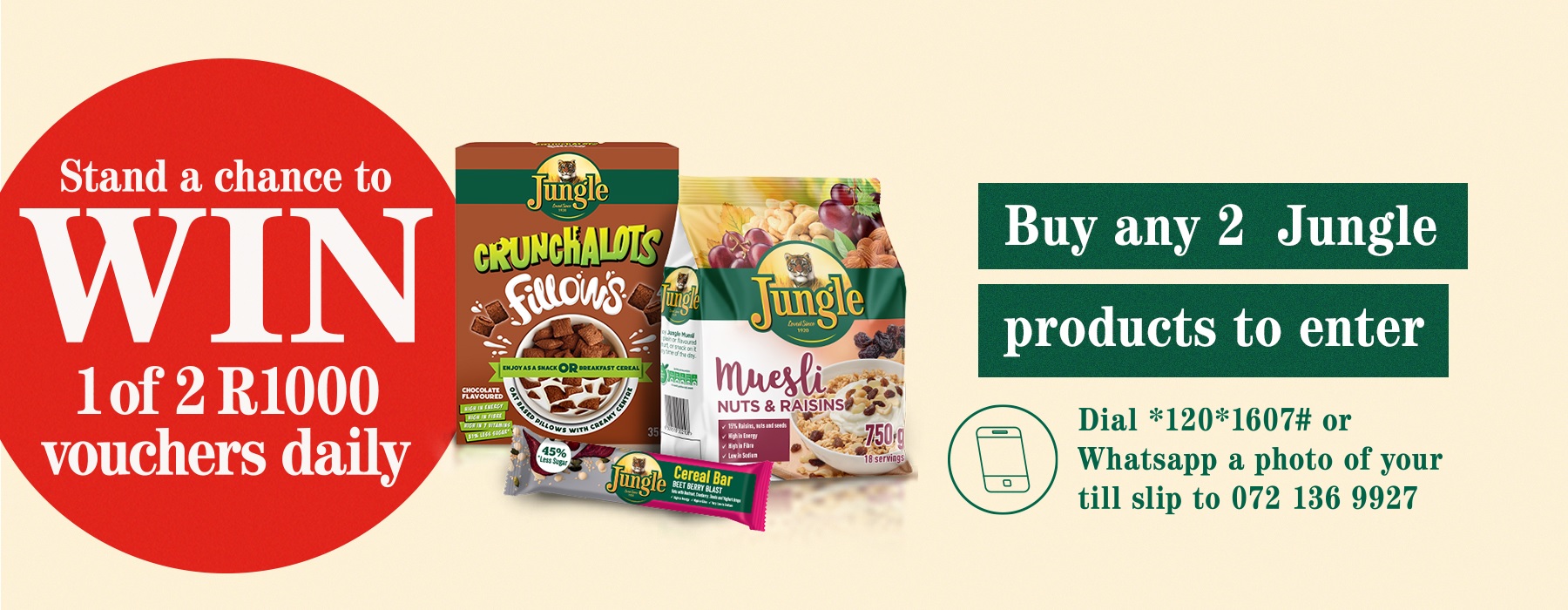 Jungle Buy & Win Promotional Competition is promoted by Tiger Consumer Brands Limited. The Participant must be a permanent resident or citizens of the Republic of South Africa. To enter this Promotional Competition Participants must purchase any 2 (two) Jungle products sold at all leading outlets. Lucky Participants stand a chance to win 1 (one) of 2 (two) vouchers to the value of R1 000.00. Last date of Competition is 31st March 2023.