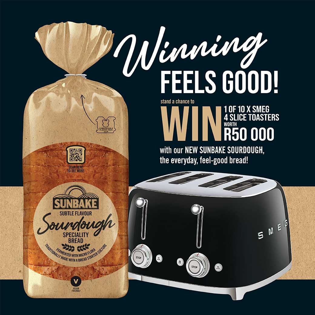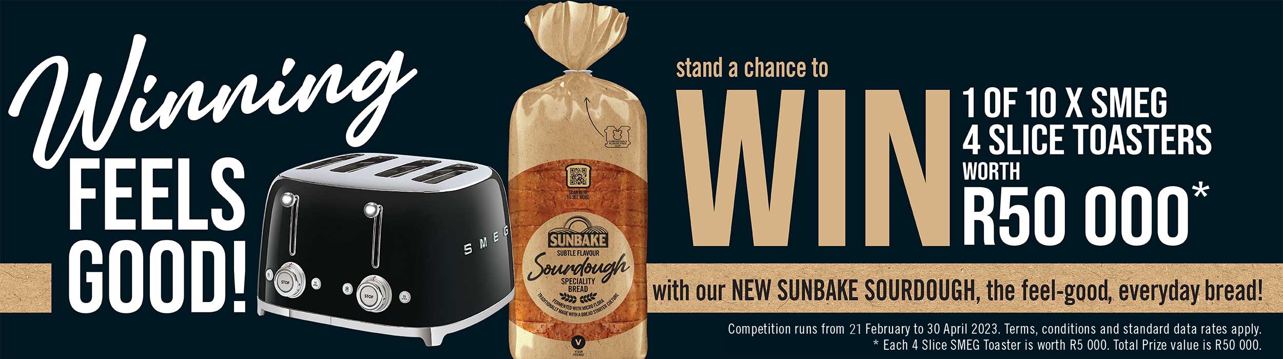 Sunbake Sourdough Competition is run by Foodcorp Proprietary Limited and Paton Tupper Proprietary Limited. Any person in South Africa who is 18 years or older may participate in this Competition. Participants must buy any Sunbake Sourdough bread promotional pack, scan the QR code on the front of the pack and follow the instructions to enter. Participants stand a chance of winning SMEG 4 Slice toasters. Last date of Competition is 30th April 2023.