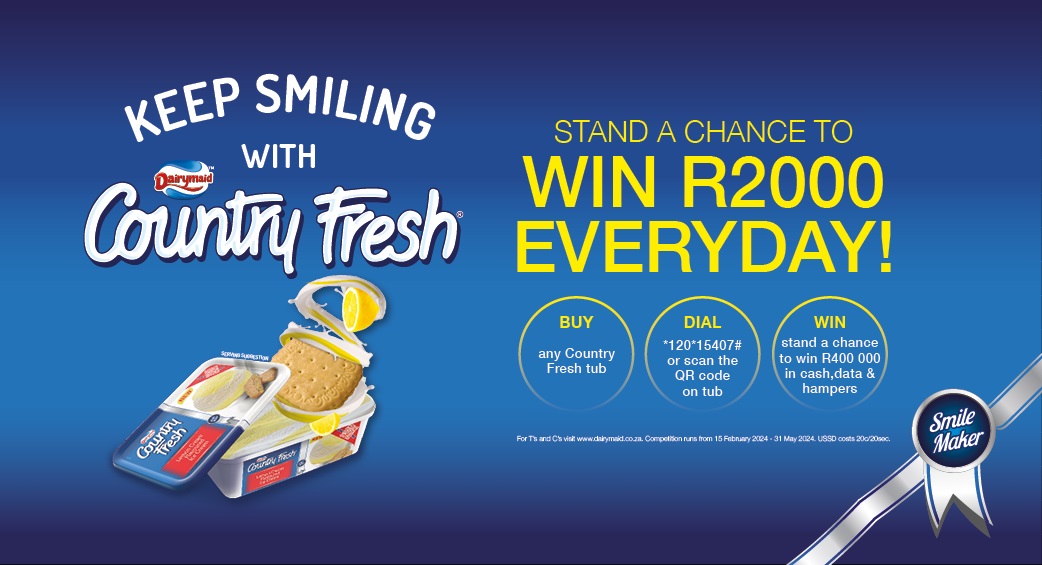 Country Fresh Easter Campaign 2024 (Competition) is operated by Dairymaid (South Africa) (Proprietary) Limited. This Competition is limited to legal residents of South Africa. Buy any participating Country Fresh product (products listed below), dial the USSD code *120*15407# and follow the prompts to enter. Keep proof of purchase (receipt/till slip) in order to be able to redeem your prize. Participate and stand a chance to win R2000 everyday. Last date of competition is 31st May 2024.