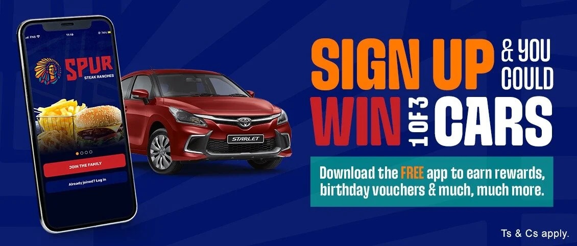 Spur Win Toyota Starlet Car Competition 2024 is conducted by Spur Advertising (Pty) Limited, may only be entered into by customers of Spur Steak Ranches restaurants in South Africa. To enter and to be eligible, entrants must sign up to the Spur Family Club (or be an existing member) and spend R250.00 or more at a participating Spur Steak Ranches restaurant. Entries for the Competition will run from 02 April 2024 to 31 May 2024.