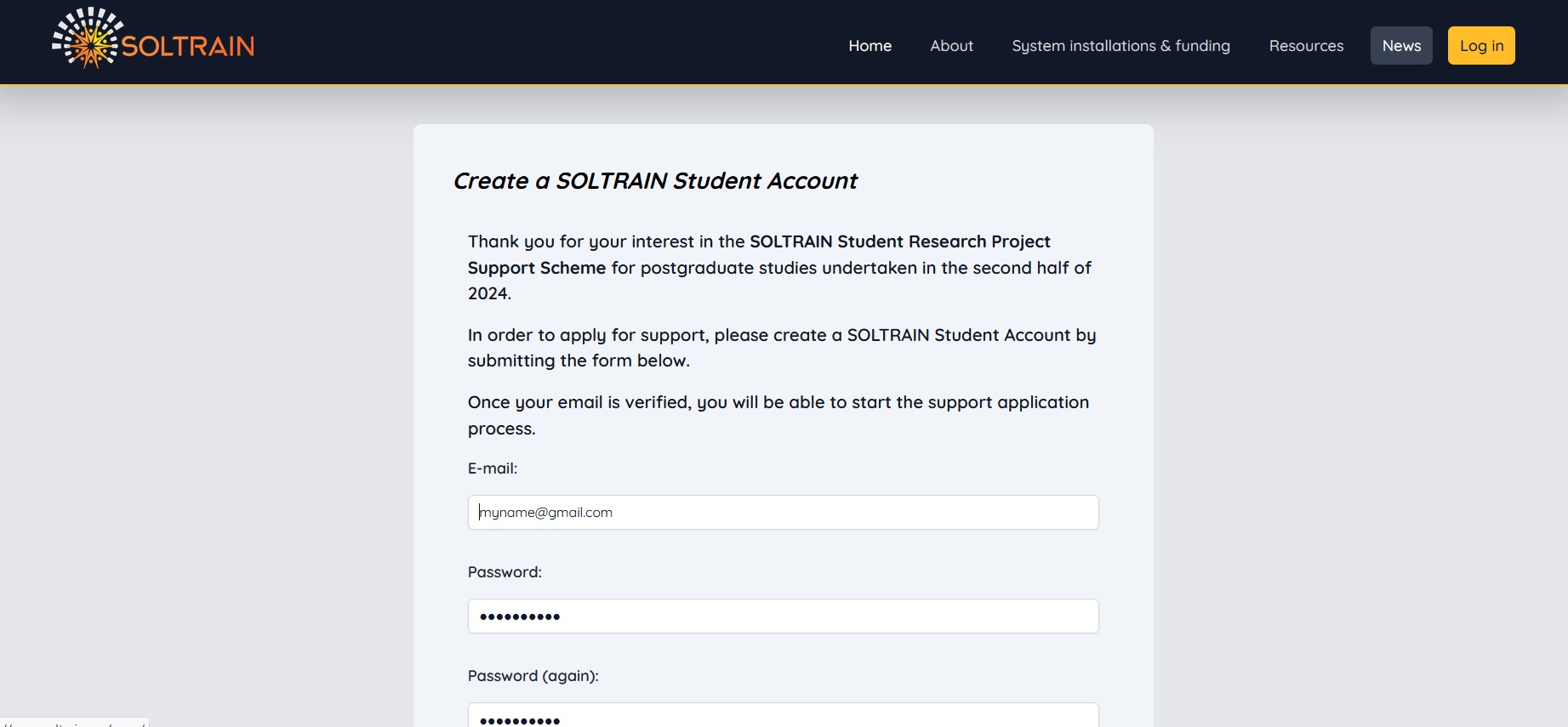 All applications need to be submitted on or before midnight on the 16th May 2024. In order to start the application process, please click the link below to register on the SOLTRAIN website as a student. Once you have verified your email, you will be able to start the application process.