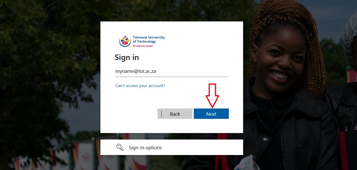 Students can enter their TUT4life email address (eg. 1234567@tut4life.tut.ac.za) and staff can enter their TUT email address