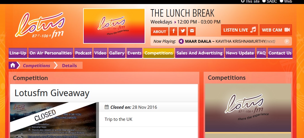 ** The SABC/ Lotus FM accept no responsibility for any problems or technical malfunction of any communication network or any late, lost, incomplete, misdirected, incorrectly submitted, delayed, illegible or corrupt entries. The SABC will not be liable for any costs incurred, responses received or any other consequences of user error.