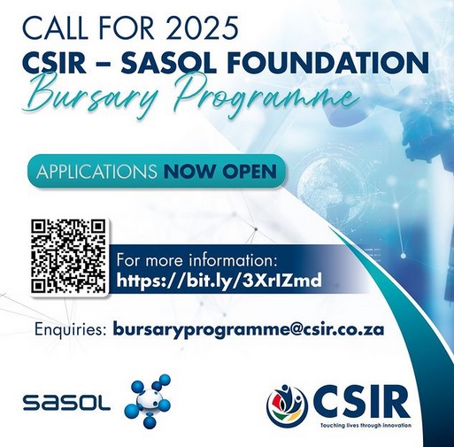 Sasol Foundation-CSIR Undergrad Bursary programme financially supports full-time, unemployed students in areas that are deemed a priority by the CSIR. It is a merit based bursary. Academic merit will be considered during the selection process, and it is imperative to increase the participation of women, black individuals and people with disabilities in science, engineering and technology. Applications are currently open. Closing date is Monday, 30 September 2024.