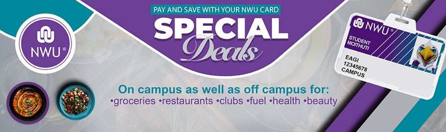 Each and every student at the NWU has a NWU student card used for access to the campus. The NWU student card can also be used for paying for your meal, cold drinks and even your next Spur lunch. The card is accepted at all the NWU own dining halls, restaurants and kiosks. It is also accepted at selected retail stores outside of campuses