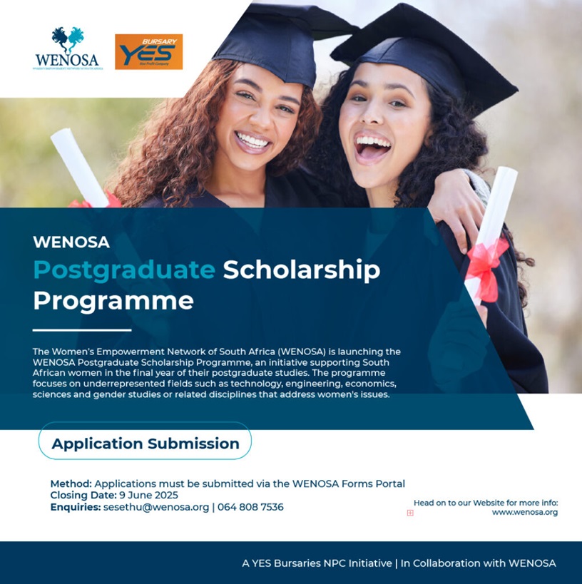 The Women’s Empowerment Network of South Africa (WENOSA) is launching the WENOSA Postgraduate Scholarship Programme, an initiative supporting South African women in the final year of their postgraduate studies. The programme focuses on underrepresented fields such as technology, engineering, economics, and the sciences. Last date of application is 9th June 2025.
