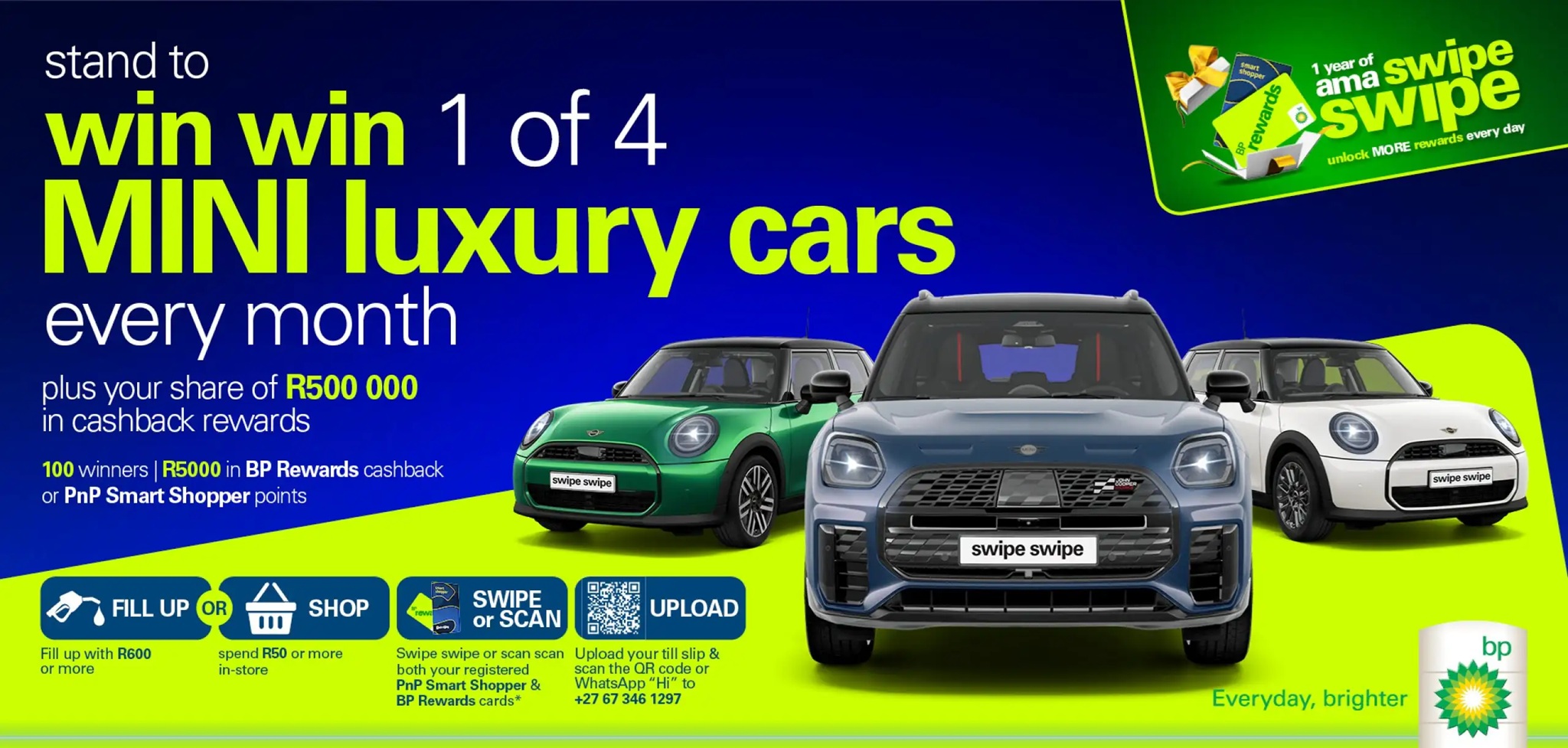 Win Win 1 of 4 MINI Coopers Competition 2025 is conducted by BP Southern Africa Pty Ltd & Pick n Pay Retailers Pty Ltd. Spend R600 or ore on fuel OR R50 or more in-store, Swipe or scan your registered BP Rewards card and Smart Shopper card and Upload your till slip on WhatsApp. Participate and win BP Rewards, Smart Shopper Points & Luxury Cars. Last date of Competition is 11th January 2026.