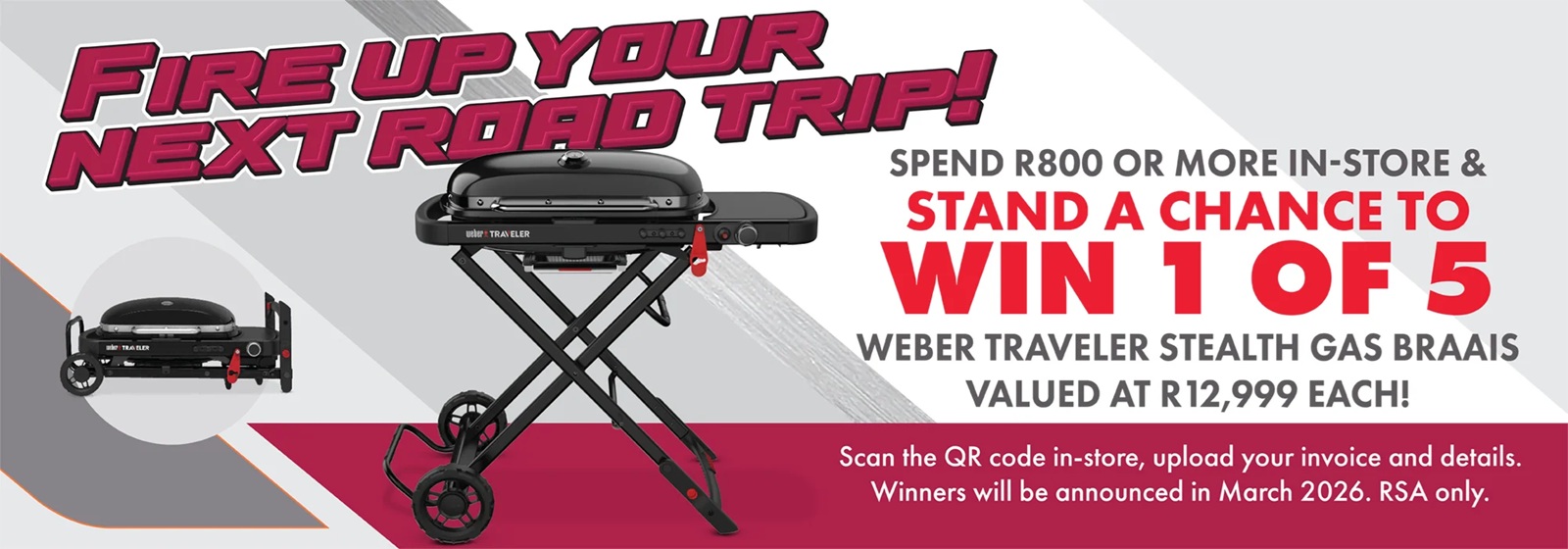 Spend R800 or More In-Store & Stand a chance to win 1 of 5 Weber Traveler Stealth Gas Braais valued at R12,999 each!
