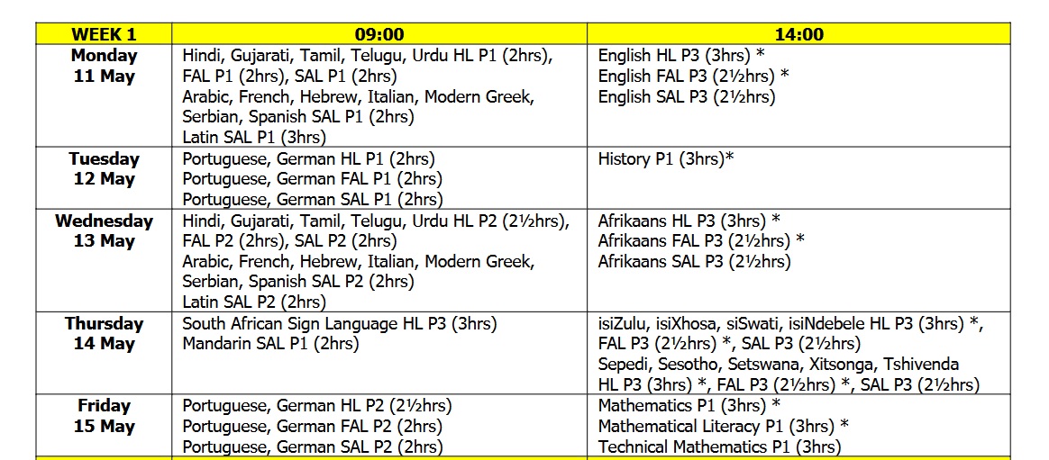 | Thursday 14 May | South African Sign Language HL P3 (3hrs) Mandarin SAL P1 (2hrs) | isiZulu, isiXhosa, siSwati, isiNdebele HL P3 (3hrs) *, FAL P3 (2½hrs) *, SAL P3 (2½hrs)