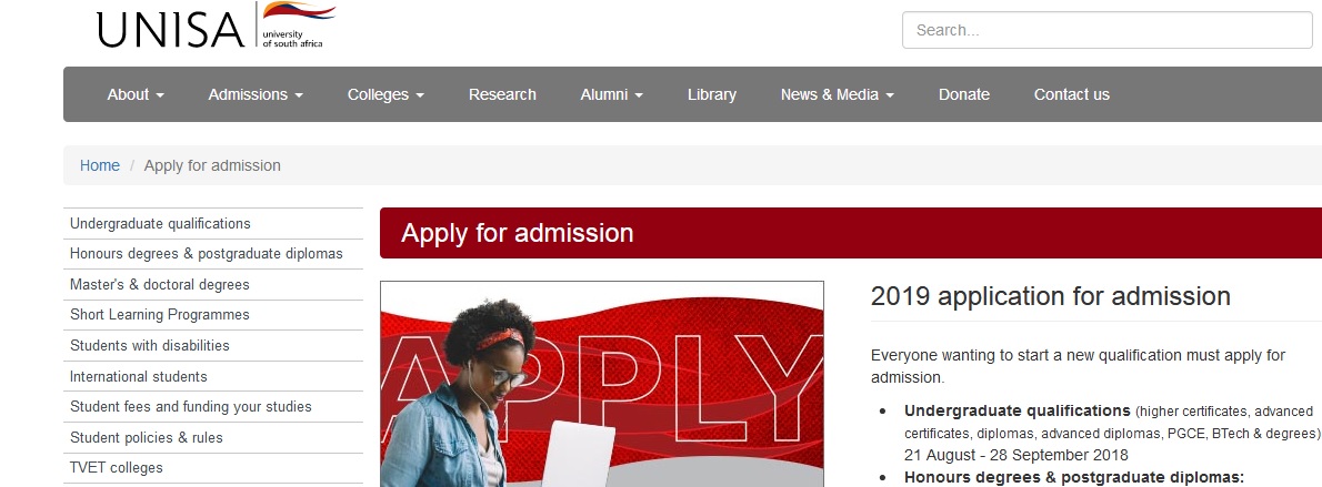 Website : http://www.unisa.ac.za/sites/corporate/default/Apply-for-admission