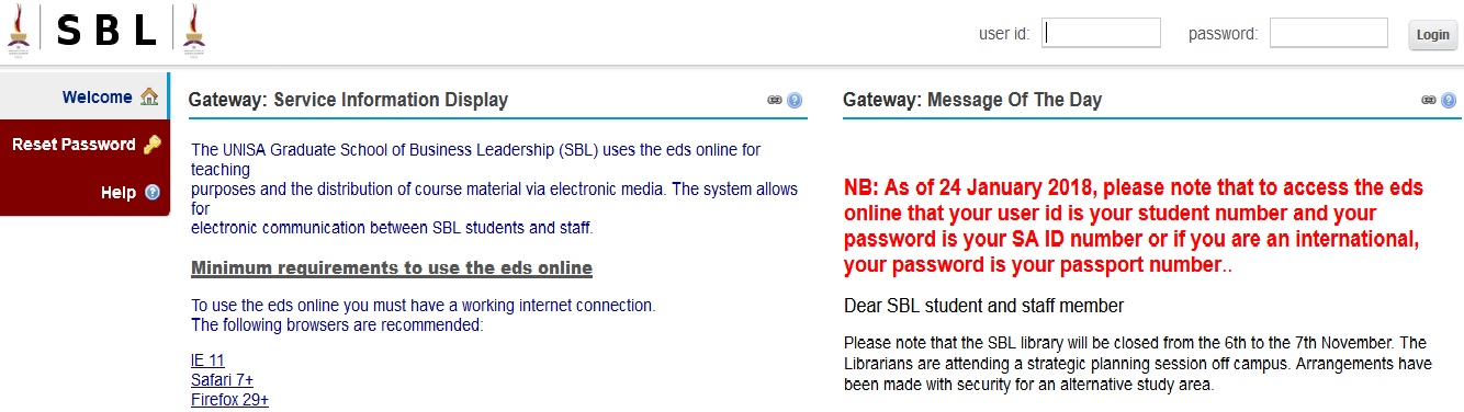 For any support for the eds online, please send an email to the following email address sbledshelp AT unisa.ac.za or Call 011 652 0250/0313